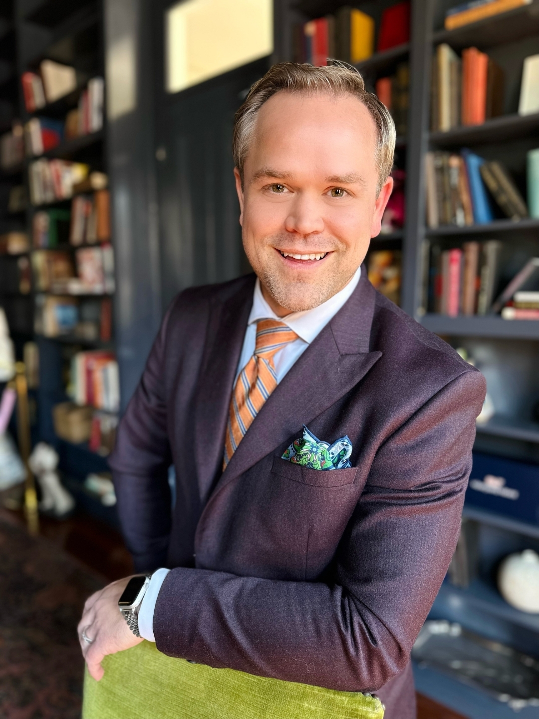 Headshot of Adam Stahura in a purple suit and orange necktie